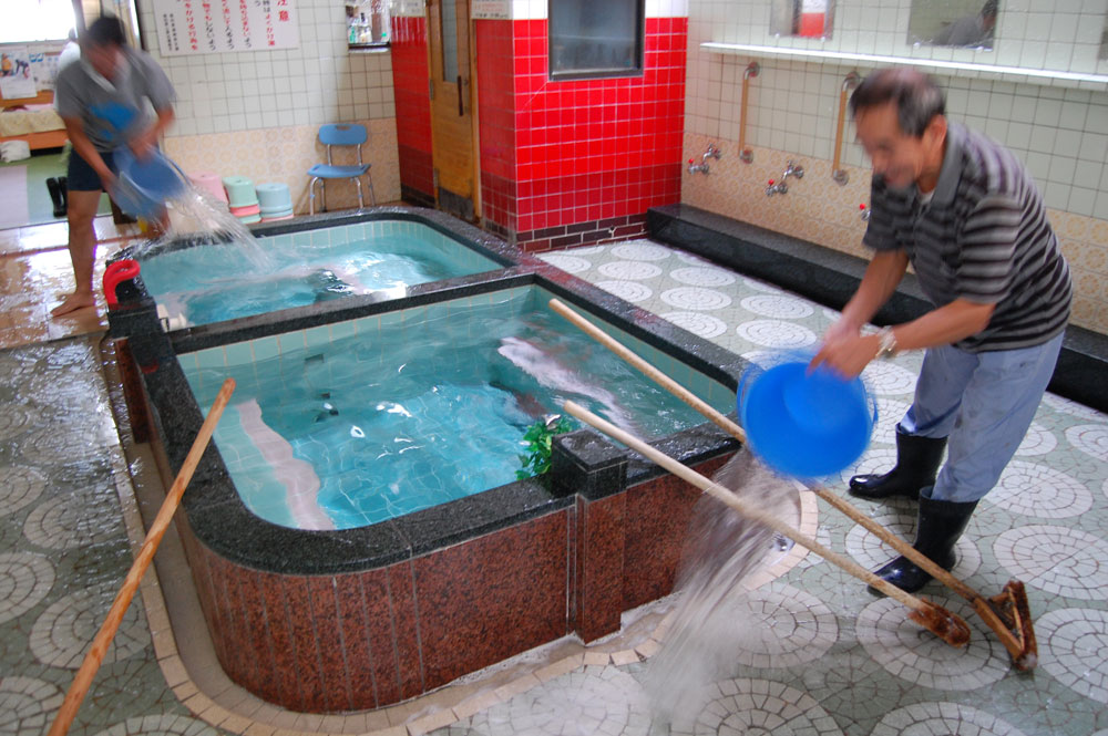 清掃は特製タワシでひたすら磨く。男3人かかりでも1時間近くかかる重労働だ。しかも一切手を抜かない。ありとあらゆるところをきっちりと磨きあげる。また、普段覗くことのできないボイラー室の見学では、大きなボイラーや濾過マシンの構造を見せてもらった。珪藻土を使ったフィルターをこまめに清掃し、お湯自体も2-3日に一回総入れ替えすることで、塩素もほとんど使わないきれいなお湯をつくってる。