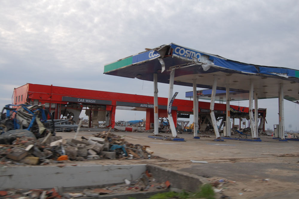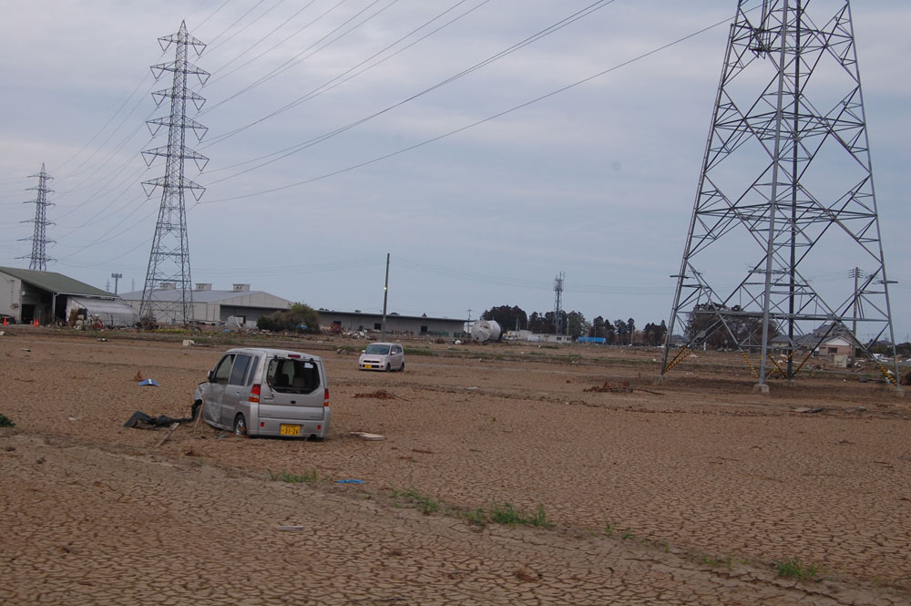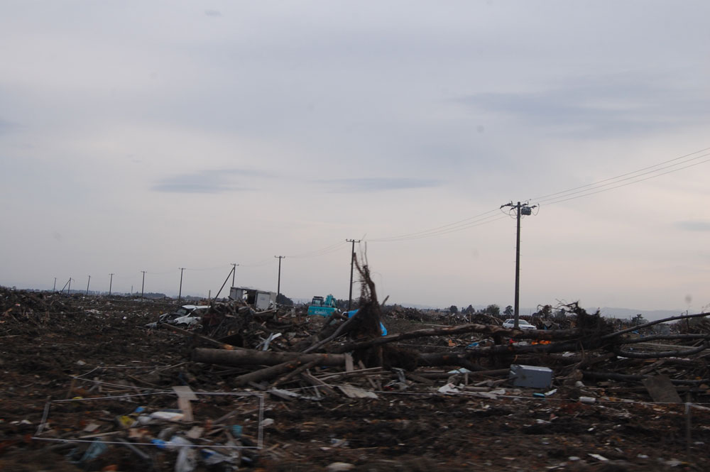 仙台を実際に訪れてみると、やっぱりテレビやネットで見ている印象とは全然違っていた。仙台の町はもう普段の日々を取り戻しているように見えた。だけど、松島に向かうために仙台東道路に入った途端、すぐ右手の車窓一面に荒野が広がった。左手は仙台の町並みが広がり、右手は荒野。あらゆるところが砂や泥に覆われ、車と瓦礫と砂防林の大木があちこちに流れ着いている。海岸沿いにあった集落も流されて、海岸まで見通せてしまう。瓦礫や車は撤去できても、この泥を除去して街や田んぼとして復活させられるのだろうかと思ってしまう。その後訪れた街でも然り。