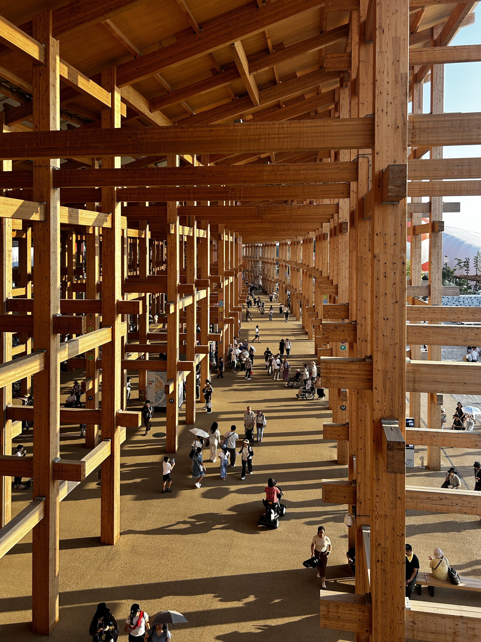 印象に残ったのは、その4割近くが高知県産の木材でできているともいう大屋根リング(Geminiによると福島浪江の木材も多いのだとか)。見るまでは実際巨大すぎる清水の舞台みたいなものかもと思っていたし、確かにでっかいだけで無駄要素多いかもしれんと思っていたし、まあひと言でいうともう少し会場内の平面計画のやり方があるのではなかろうかなんてことを思っていた。