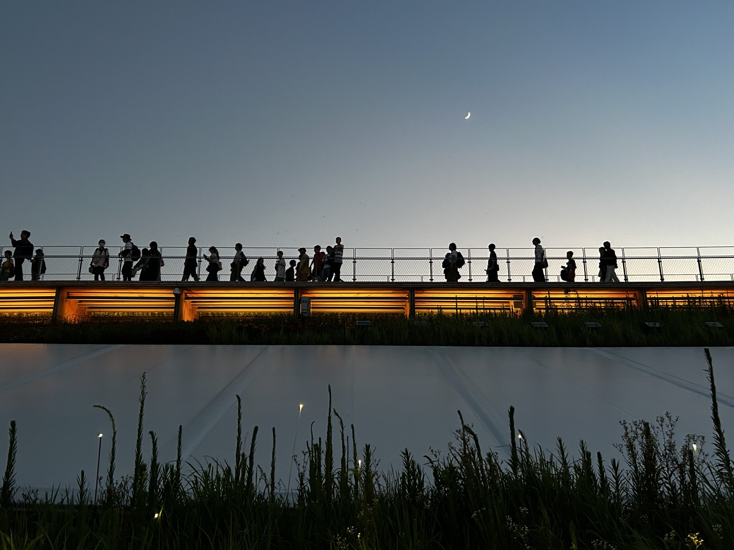 2日目の夕方、涼しくなった頃あいを見てリングの屋根へ向かった。屋根の上はのっぺりしたただの通路みたいなものなのかと思っていたら、広くなったり細くなったり分かれたり、緩やかな坂があったり草花の間を抜けるような道があったりと絶え間なく変化があり、インドやイタリアあたりでは賑やかな音楽が聞こえてきたり、ドイツや韓国のあたりはまるで賑やかな街の中を抜けるような雰囲気があったりして、足が完全に棒になっていることも忘れ、45分ほどかけて一周してしまった。